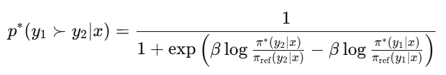 위 보상 함수 공식을 바탕으로, 이를 Bradley-Terry 모델(선호도 비교 모델)에 적용하면 최적의 정책이 아래와 같은 형태로 유도됨을 알 수 있다.