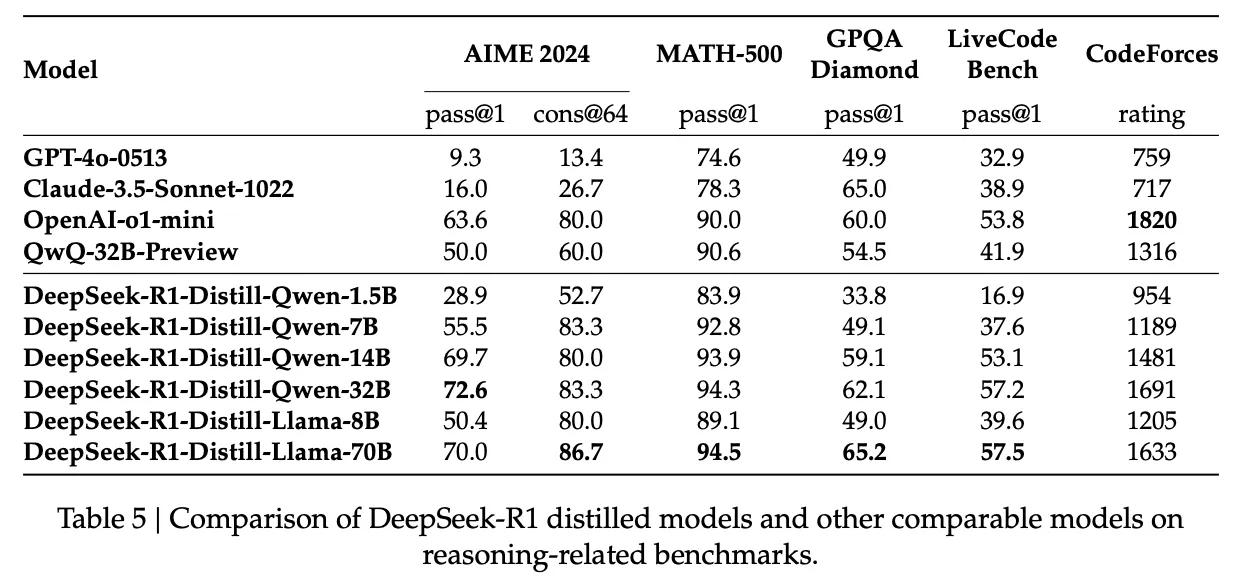 아래 Table 5는 단순 DeepSeek-R1의 출력을 증류하는 것만으로도 효율적인 DeepSeek-R1-7B 모델이 GPQA Diamond를 제외한 모든 측면에서 GPT-4o-0513을 능가하는 성능을 보인다. DeepSeek-R1-70B에서는 CodeForces를 제외한 대부분의 벤치마크에서 OpenAi-o1-mini를 크게 상회했다. 이를 통해 증류 기법의 강력한 가능성을 입증했고, 증류된 모델에 강화 학습을 적용할 경우 상당한 추가 성능의 향상이 발생함을 확인했다.