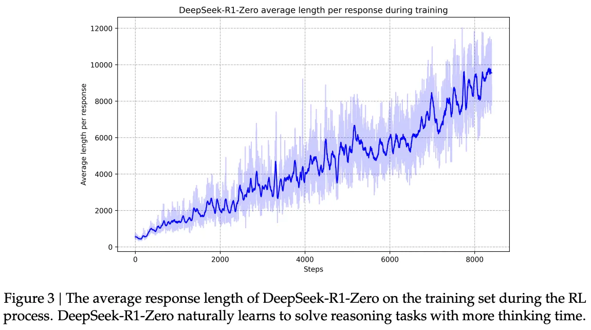 Figure 3를 보면 DeepSeek-R1-Zero의 사고 시간은 훈련 과정동안 지속적으로 개선되는 모습을 보여준다. DeepSeek-R1-Zero는 확장된 시험 시간을 활용하여 점차 복잡한 추론 작업을 해결하는 능력을 자연스럽게 획득한다. 이를 통해 수백 수천의 토큰을 생성하고 더 깊은 사고과정을 탐색하고 다듬을 수 있다.