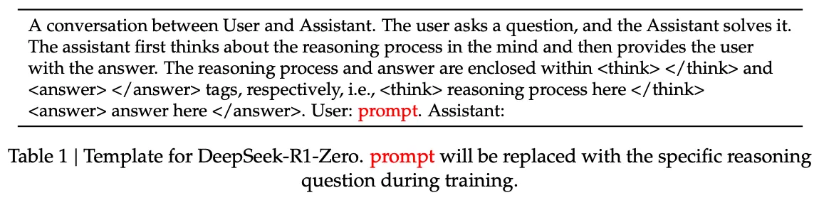 추론 과정(reasoning proccess)을 생성한 후 최종 답변(final answer)을 도출하도록 요구한다. 이러한 구조를 통해 반성적 추론(reflective reasoning)을 강제하여 특정 문제 해결 전략을 장려하며 모델의 자가 학습 과정을 확인할 수 있다.