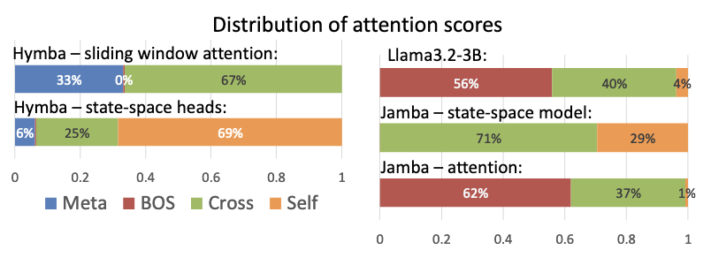 * 메타 토큰, 어텐션 헤드, SSM 헤드가 상호 보완적으로 작동하여 보다 균형 잡힌 어텐션 분포를 형성