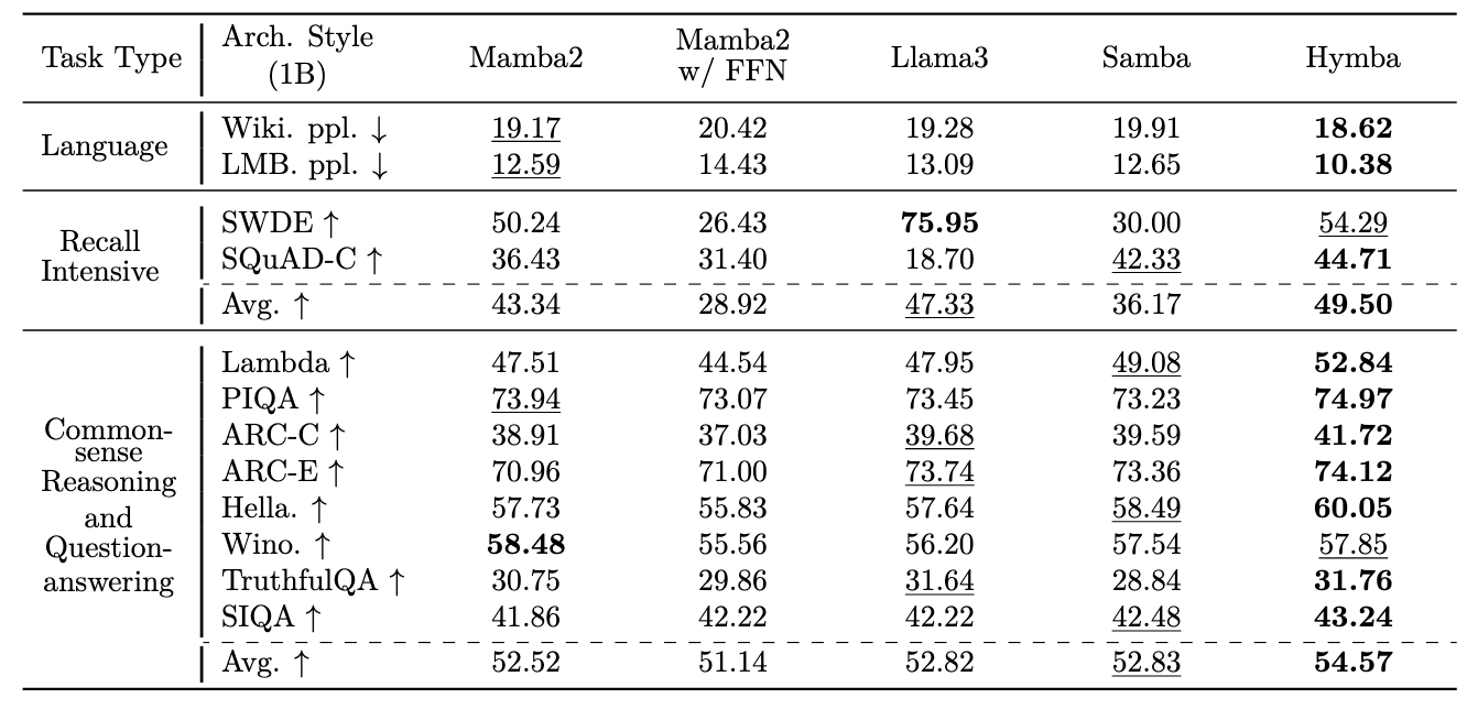 * Hymba 모델은 대부분의 작업에서 다른 1B 모델보다 우수한 성능을 지속적으로 기록