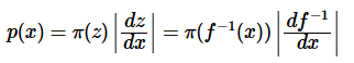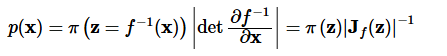 이제 이를 분포를 알고있는 z~ π(z)로부터 x의 분포를 구하는 것에 적용해보자. 변수 변환과 자코비안의 성질을 통해 아래와 같은 식을 얻을 수 있다.