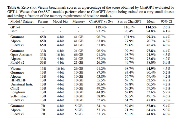qlora를 사용하여 학습된 Guanaco 모델은 Vicuna 벤치마크에서 이전의 모든 공개 모델을 능가하는 성능을 보였다. Guanaco 65B는 ChatGPT 성능 수준의 99.3%에 도달했으며, 이는 단일 GPU에서 24시간 파인튜만으로 달성한 결과다. Guanaco 33B는 Vicuna 13B보다 더 많은 파라미터를 가졌음에도 4비트 정밀도를 사용하여 메모리 효율성을 높였다.