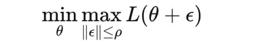 계속해서 나오는 SAM 최적화 방식인데, 이는 모델 파라미터 세타에 대해서 약간의 perturbation 입실론을 가한 뒤, 그 손실의 최대를 최소화시키는 min man 최적화를 목적함수로 둔다.