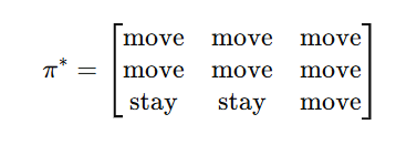 즉, 대부분의 상태에서는 move가 최적 행동이지만, 용암 지역으로 떨어질 위험이 큰 일부 상태에서는 stay가 더 나은 선택이 된다.
