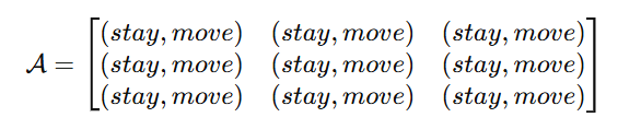 상태-행동 집합 A\mathcal{A}: 각 상태에서 가능한 행동은 (stay,move)