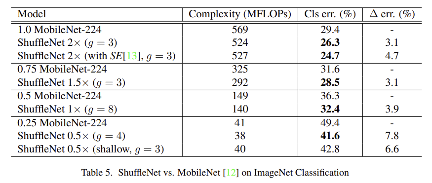 위 표는 ShuffleNet과 MobileNet의 성능을 비교한 표이다. 비슷한 complexity를 맞추어 실험했을 때 MobileNet에서보다 ShuffleNet에서 더 좋은 성능이 나타남을 확인할 수 있다.