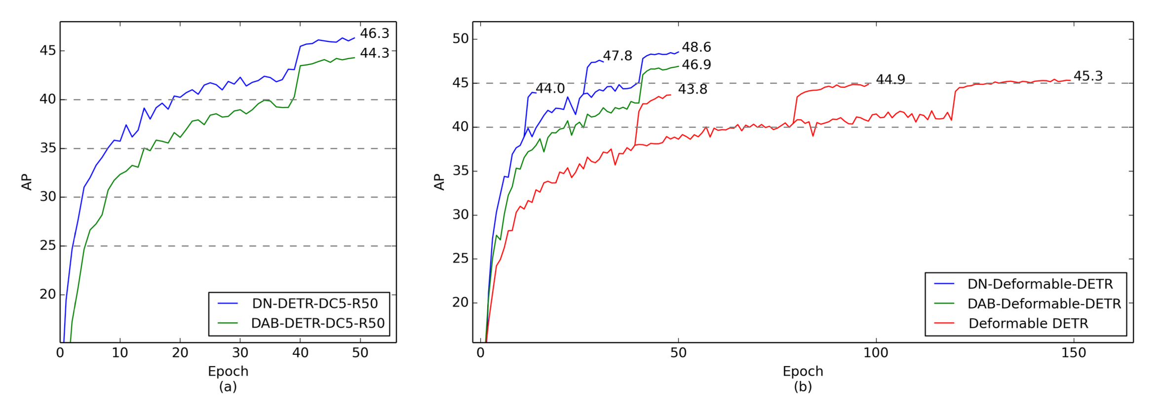 DN-DETR은 학습 초반부터 DAB-DETR보다 훨씬 빠르게 AP가 상승하며, 더 높은 최종 AP를 달성한다.