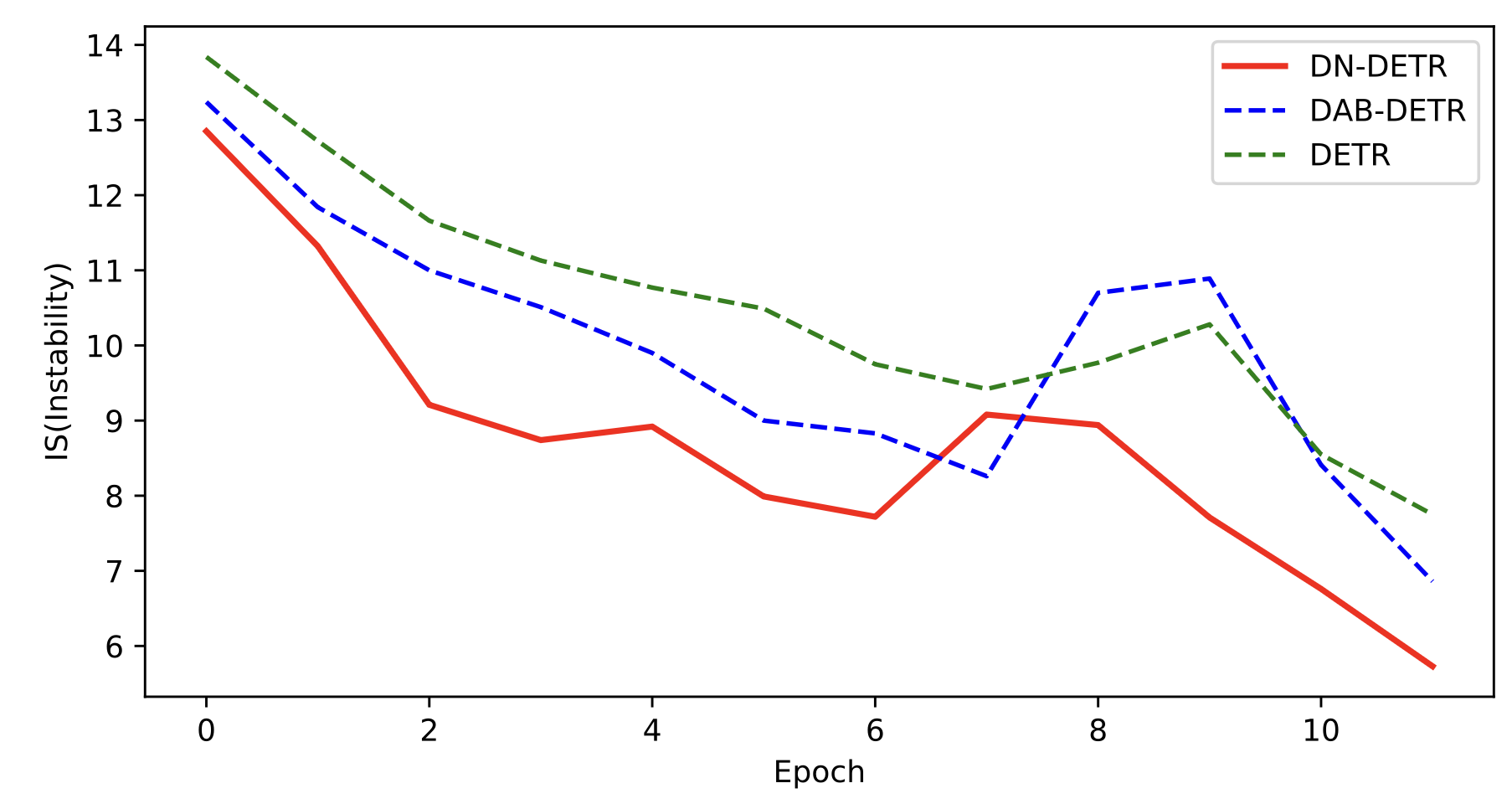 Vanilla DETR, 베이스라인 DAB-DETR과 논문에서 제안한 DN-DETR 의 IS를 계산해 비교한 그래프는 아래와 같다.