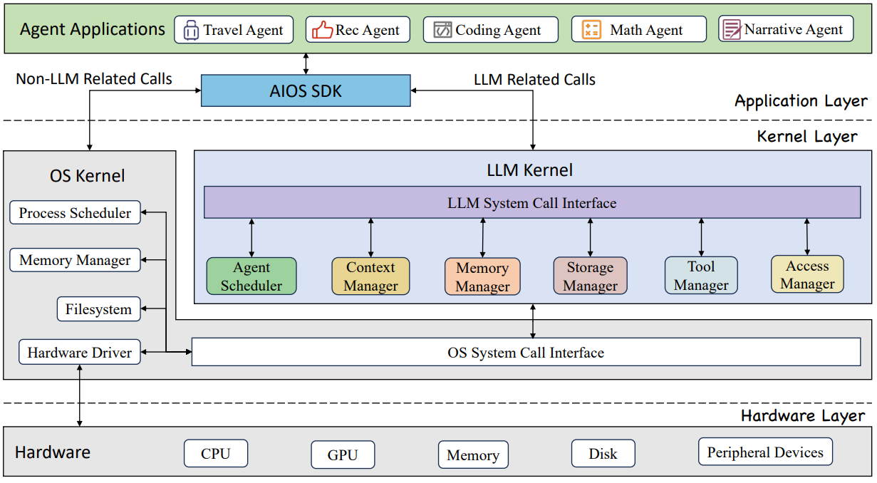 • Agent Scheduler, Context Manage, Memory Manager, Storage Manager, Tool Manager, Access Manager