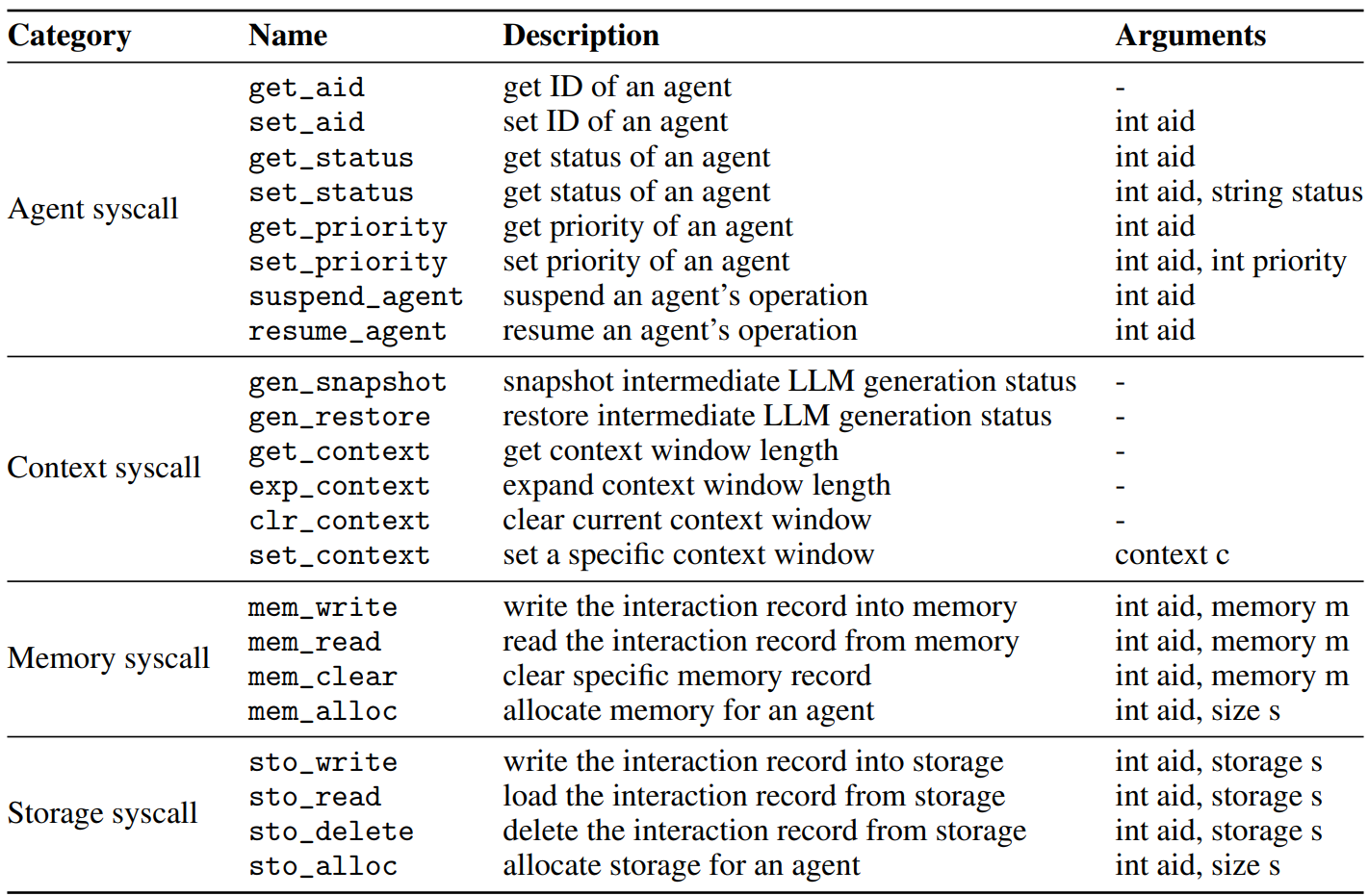 • LLM 커널 내의 LLM 시스템 콜 인터페이스는 기본적인 LLM 호출 작업 기능을 제공하도록 설계되었다.